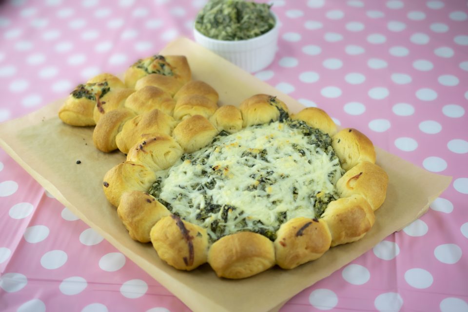 Form the bunny shape and scoop your spinach dip mixture into the center of the bunny and ears. Sprinkle the spinach dip with mozzarella cheese before baking at 375 F for 18 minutes.