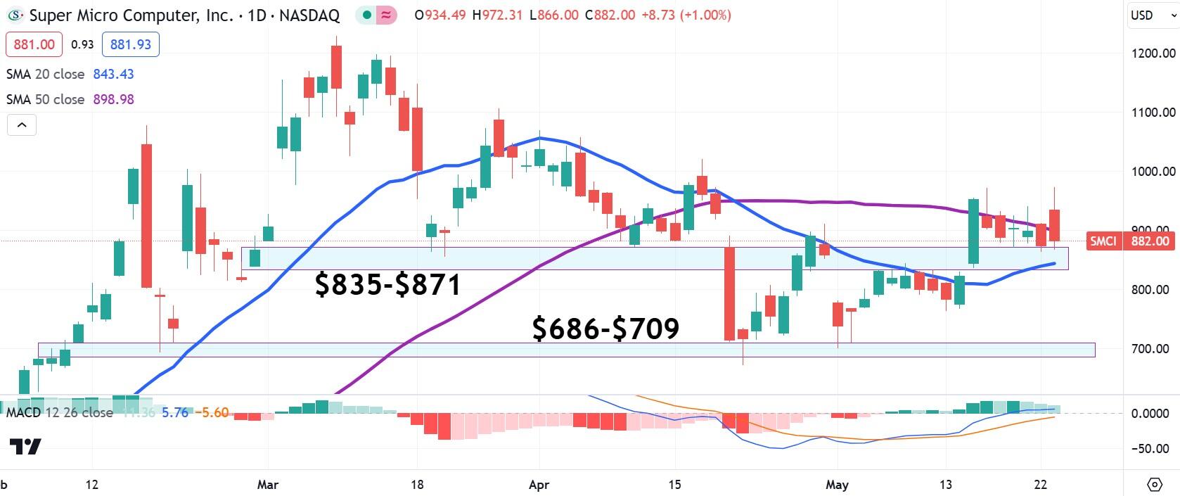 SMCI stock did bounce off support in the $835 to $871 range, but it’s unlikely that will hold. SMCI stock is already trading beneath the 50-day Simple Moving Average (SMA), which is bearishly trading above the 20-day SMA. A better bet is the support band ranging from $686 to $709 that stems from February price dynamics.