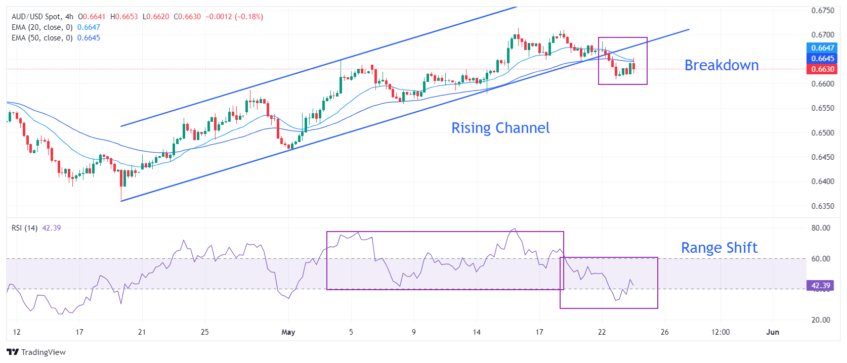 AUD/USD has come under pressure after a breakdown of the Rising Channel chart pattern formed on a four-hour timeframe. A breakdown of the above-mentioned pattern suggests an establishment of a bearish reversal. The near-term outlook of the Aussie asset would worsen as the 20- and 50-period Exponential Moving Averages (EMAs) are on the verge of delivering a bearish crossover.