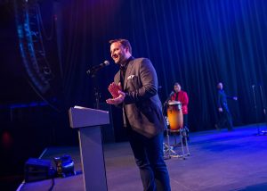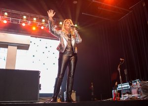 Auctioneer Wendy Lambert leads the Raise Hope paddle raise.